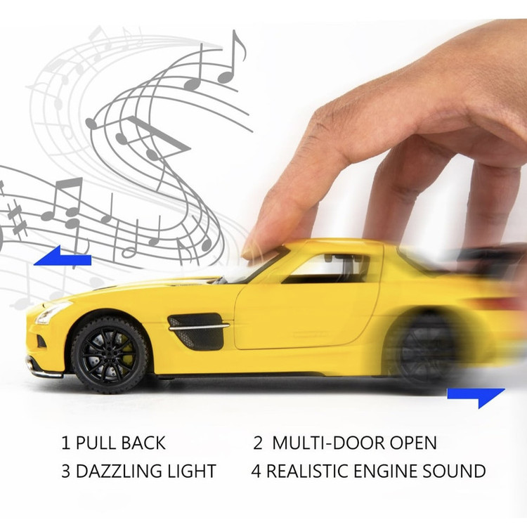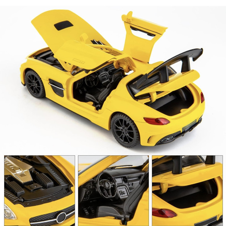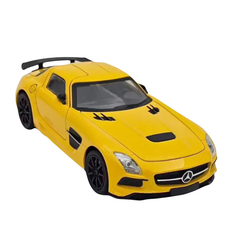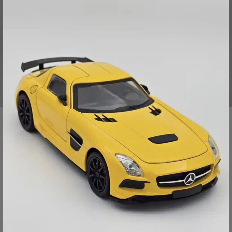 ماکت بسیار زیبا جذاب خاص دوست داشتنی با کیفیت و نوش ساخت مرسدس بنز SLS AMG در مقیاس ۱/۲۴ میباشد. بدنه تنام فلزی چراغهای جلو عقب روشن میشود دارای کلید سه حالته هست چرخها فرمانپذیر است درب باک باز شو است آینها تاشو هست بوق روی فرمان دارد.