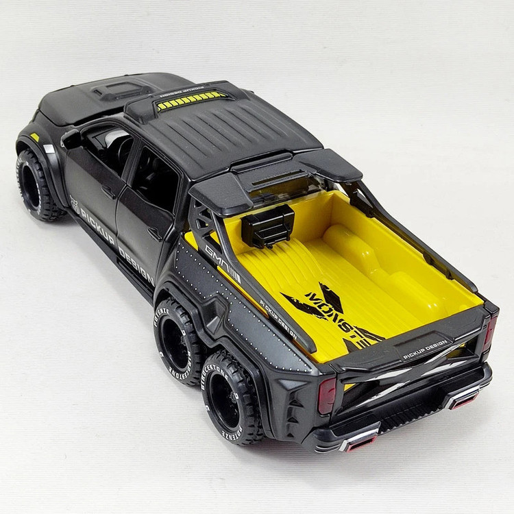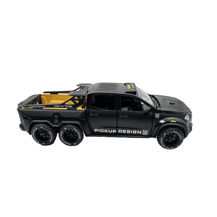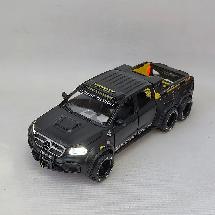 اسباب بازی ماشین فلزی مدل بنز پیکاپ یک ماشین از جنس فلز بوده که دارای باطری سکه ای جهت روشن شدن چراغ های جلو و عقب و همچنین صدای استارت ماشین می باشد. این ماشین فلزی از کیفیت ساخت بسیار بالایی برخوردار بوده و همچنین 4 درب بغل و درب کاپوت و درب صندوق عقب آن قابلیت باز و بسته شدن دارد.