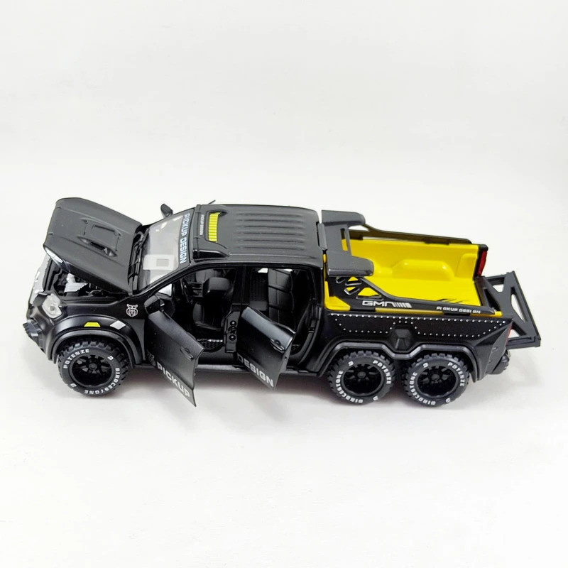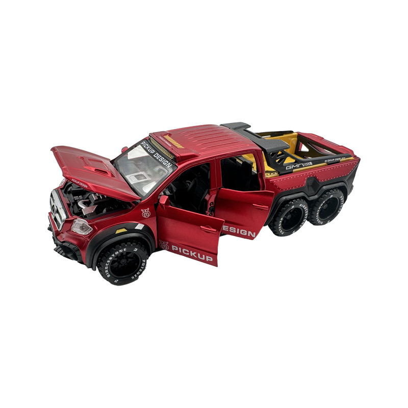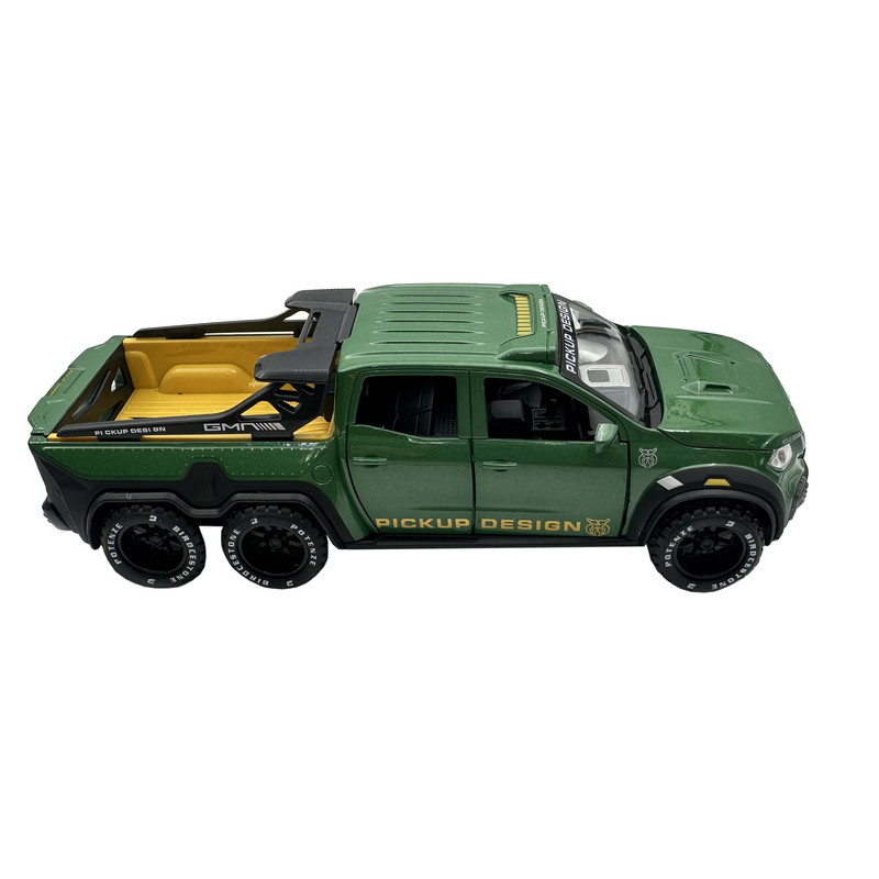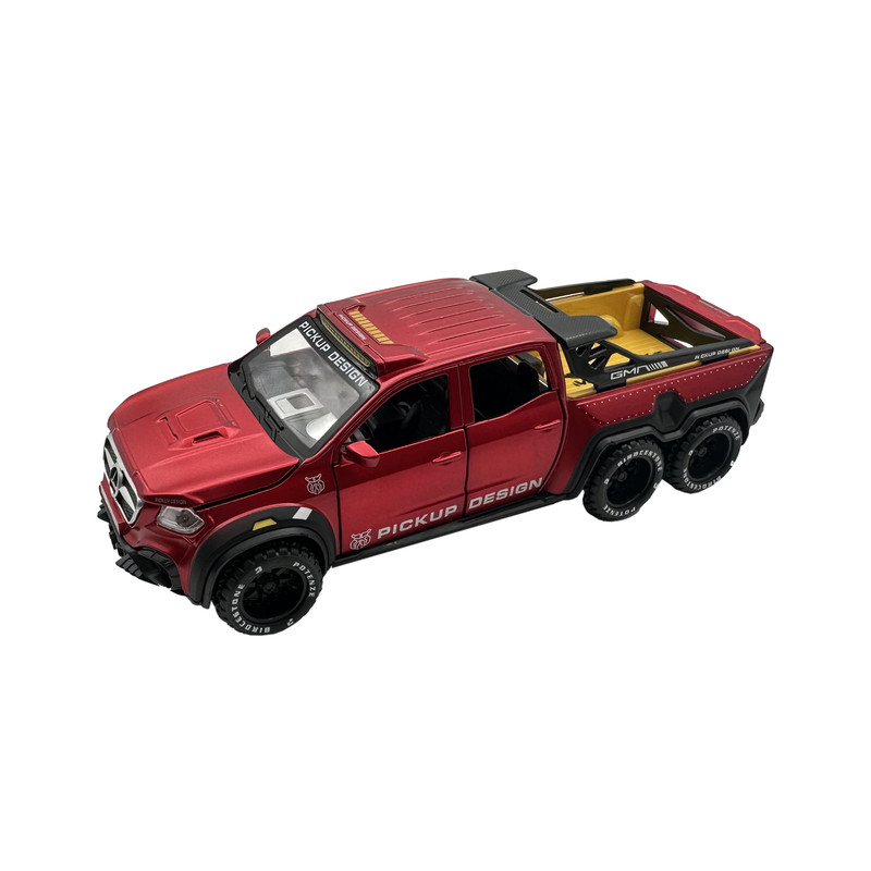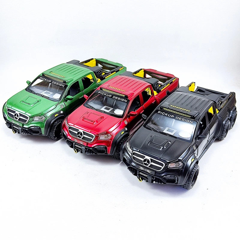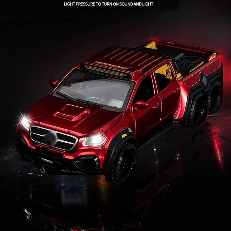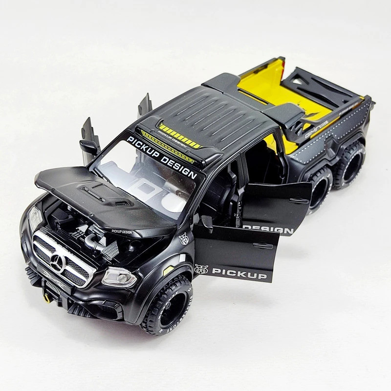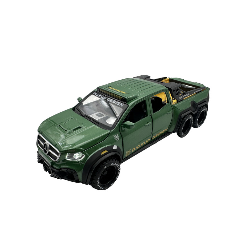 اسباب بازی ماشین فلزی مدل بنز پیکاپ یک ماشین از جنس فلز بوده که دارای باطری سکه ای جهت روشن شدن چراغ های جلو و عقب و همچنین صدای استارت ماشین می باشد. این ماشین فلزی از کیفیت ساخت بسیار بالایی برخوردار بوده و همچنین 4 درب بغل و درب کاپوت و درب صندوق عقب آن قابلیت باز و بسته شدن دارد.